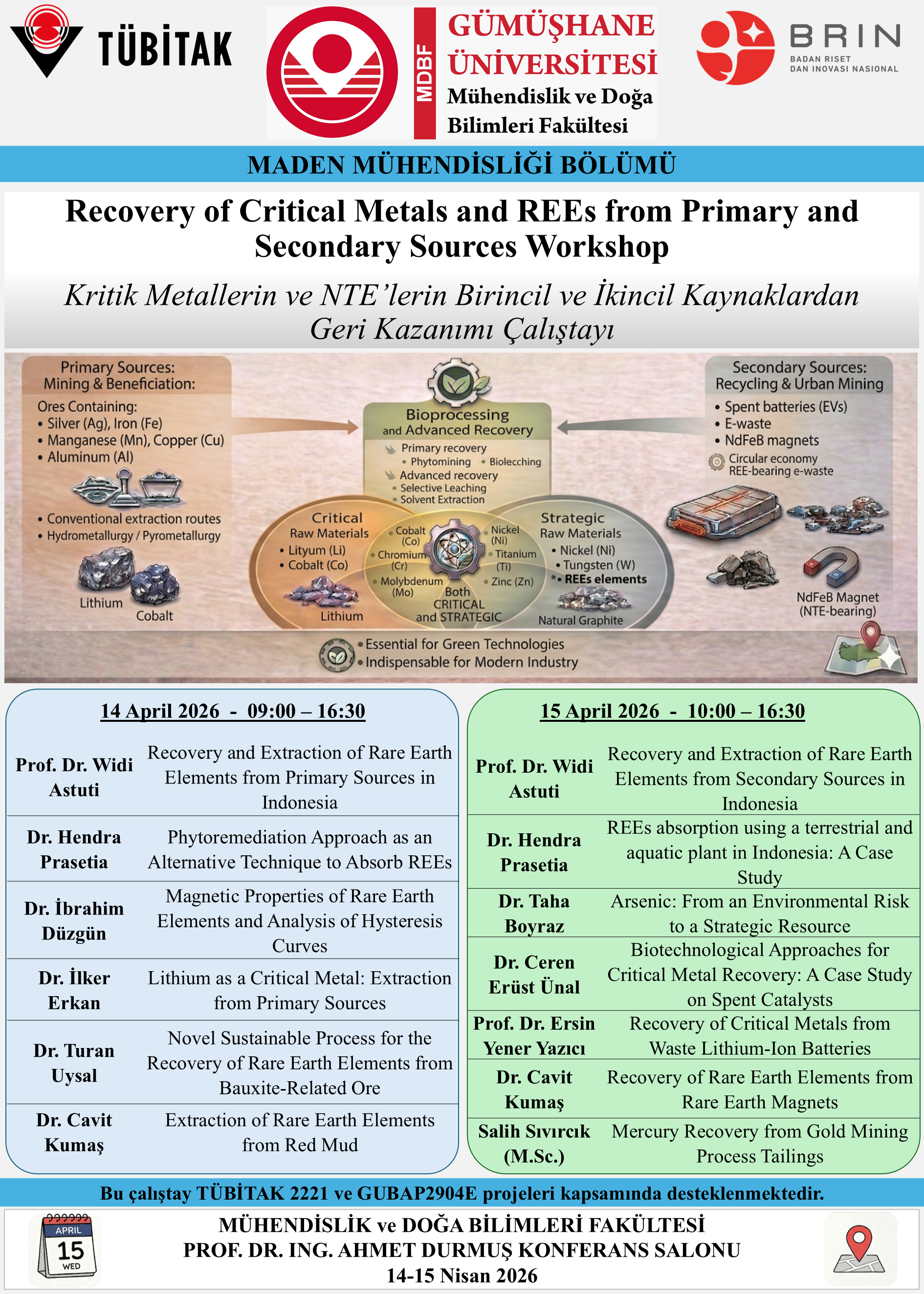 Gümüşhane Üniversitesi Mühendislik ve Doğa Bilimleri Fakültesi Maden Mühendisliği Bölümü bünyesinde, TÜBİTAK 2221-Konuk veya Akademik İzinli (Sabbatical) Bilim İnsanı Destekleme Programı kapsamında, düzenlenen ve Endonezya Ulusal Araştırma ve İnovasyon Ajansı (BRIN) Mineral Teknolojileri Araştırma Merkezi’nden Prof. Dr. Widi Astuti ve Dr. Hendra Prasetia’nın katılım sağlayacağı "Kritik Metallerin ve NTE’lerin Birincil ve İkincil Kaynaklardan Geri Kazanımı Çalıştayı" 14-15 Nisan 2026 tarihlerinde Mühendislik ve Doğa Bilimleri Fakültesi Prof. Dr. Ing. Ahmet Durmuş Konferasn Salonunda gerçekleştirilecektir.