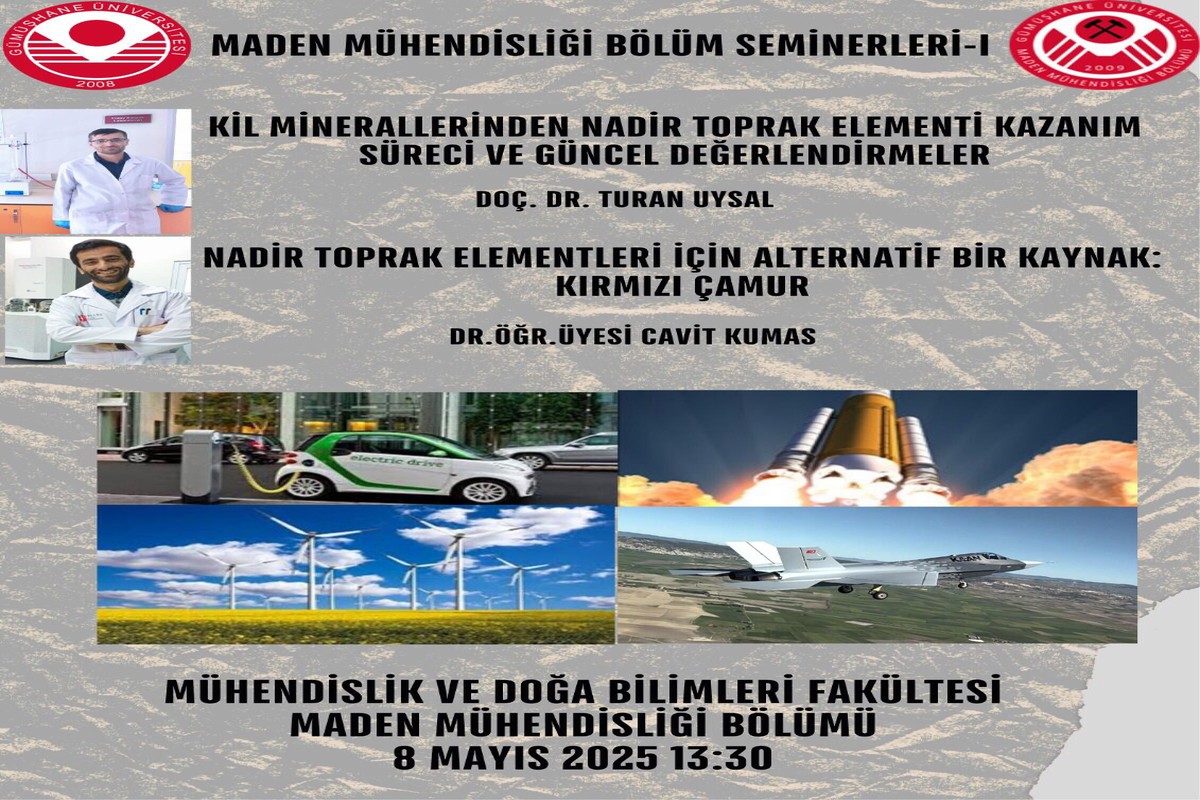 Maden mühendisliği bölümü tarafından düzenlenen “Bilim Seminerleri - I” etkinliği düzenlendi. Bu bilim seminerlerinin belirli aralıklarla düzenli bir şekilde devam etmesi planlanmaktadır. Bu kapsamda yapılan ilk etkinlik madencilik ve enerji alanlarında çalışan araştırmacıları, lisans, lisansüstü öğrencilerini bir araya getirmiştir. Etkinlikte, Gümüşhane Üniversitesi Maden Mühendisliği Bölümü öğretim üyesi Doç. Dr. Turan Uysal ile Dr. Öğr. Üyesi Cavit Kumaş’ın sunduğu çalışmalar, nadir toprak elementleri (NTE) üzerine stratejik öneme sahip güncel yaklaşımları gözler önüne serdi.
