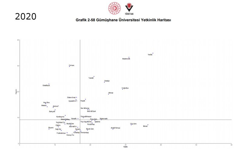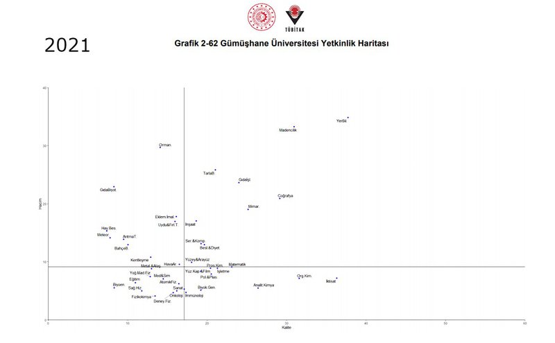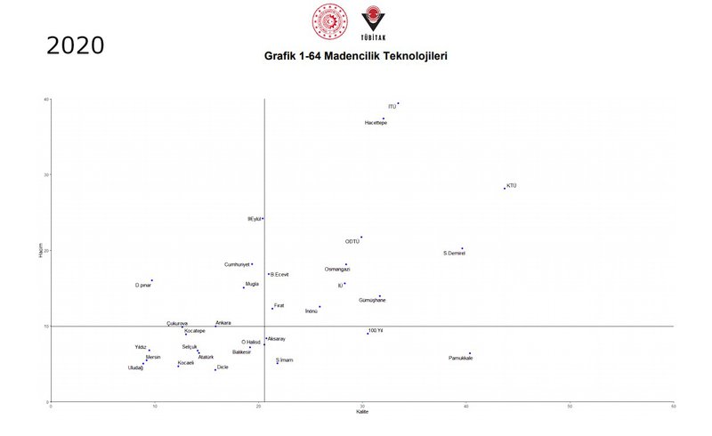 Tüm üniversitelerin karşılaştırıldığı 2020 ve 2021 yılları ‘Alan Bazlı Yetkinlik Analizi’ grafiklerinde, Üniversitemiz Madencilik Teknolojileri alanında 1’inci bölgede yer alma başarısını gösterdi. Hacim ve kalite bakımından diğer üniversiteler ile karşılaştırıldığında, 2020 yılında ilk 10 üniversite, 2021 yılında ise ilk 15 üniversite arasına girme başarısını gösterdi. Karşılaştırması yapılan üniversitelerin toplam sayısının 100 civarında olduğu dikkate alındığında, Üniversitemizin ‘Madencilik Teknolojileri’ yetkinlik alanında etkin bir üniversite olduğu açıkça ifade edilmekte. Üniversite içi yetkinlik alanlarının karşılaştırıldığı grafikte ise, Madencilik, Üniversitemiz bünyesindeki bir çok alanı geride bırakarak, yine 1. bölgede yer alma başarısını göstermiştir.