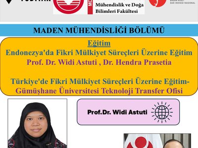 Gümüşhane Üniversitesi Mühendislik ve Doğa Bilimleri Fakültesi Maden Mühendisliği Bölümü tarafından, Endonezya'da Fikri Mülkiyet Süreçleri hakkında “Endonezya’da Fikri Mülkiyet Süreçleri Üzerine Eğitim" başlıklı bir etkinlik düzenlenecektir.